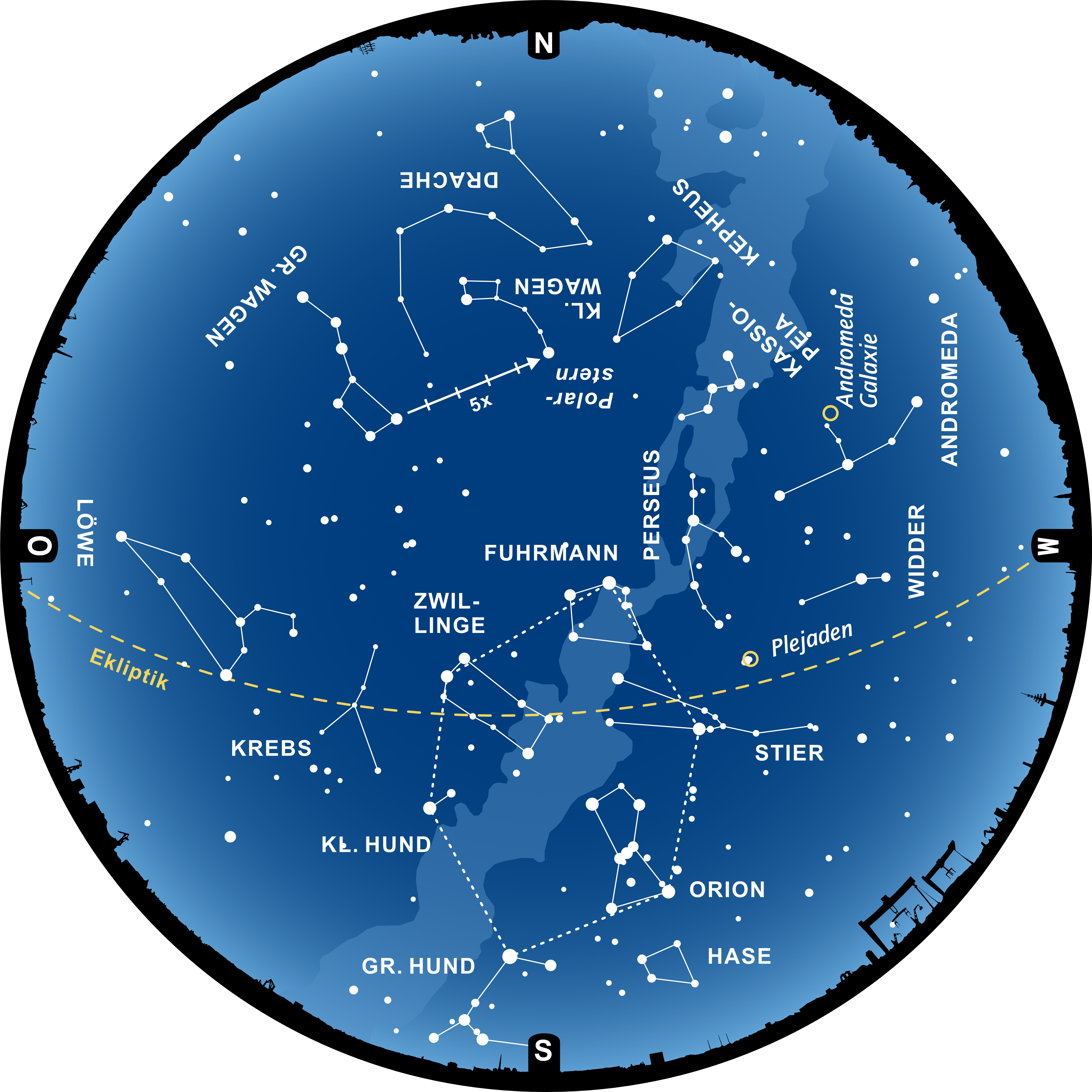 | Jupiter steht im Sternbild Zwillinge und erreicht am 10. Januar seine Opposition. Er ist dann die ganze Nacht über zu sehen. Im März fängt er an, früher unterzugehen, Ende März bereits um 3 Uhr. | |