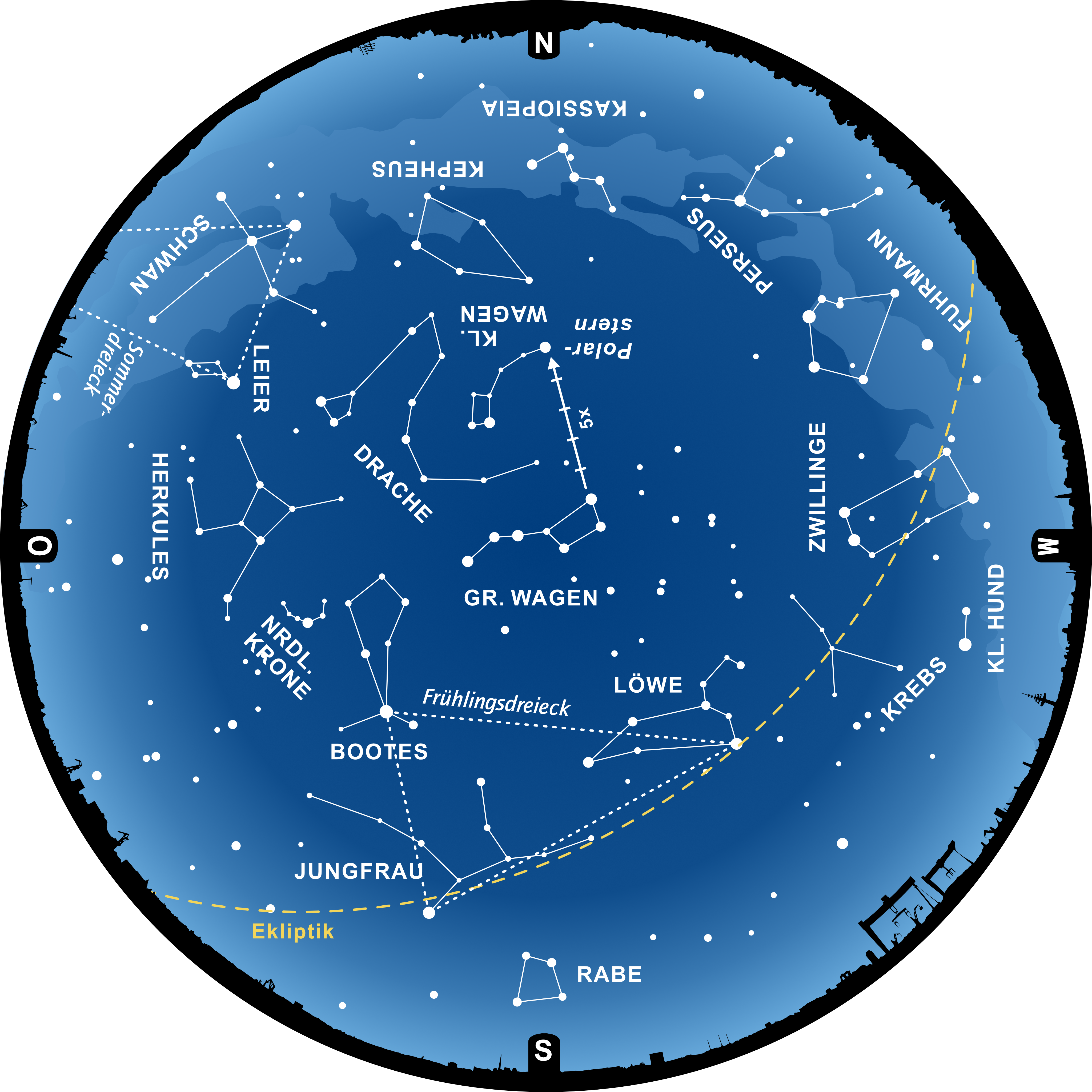 | Der innerste Planet Merkur ist am Anfang des Quartals nicht zu sehen. Er zeigt sich Ende Mai/Anfang Juni für kurze Zeit im Westen am Abendhimmel. | |
